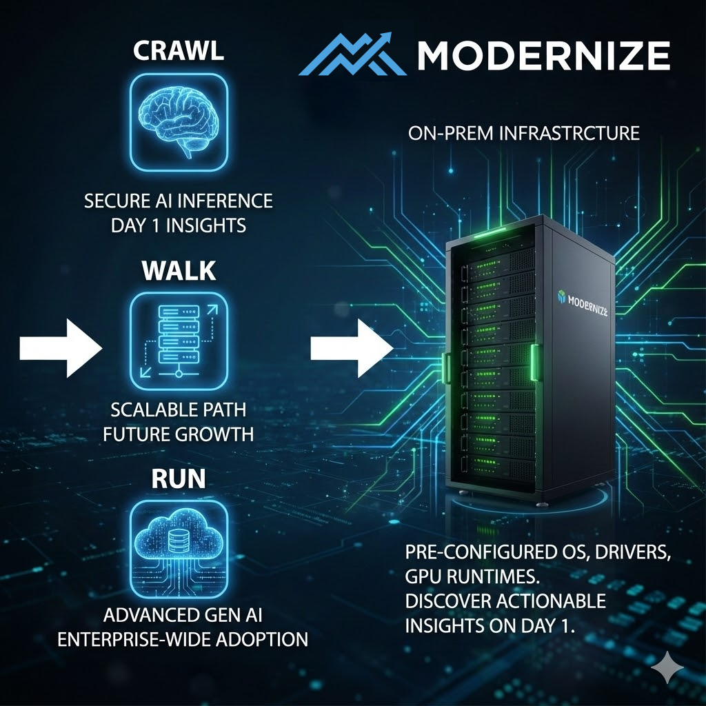 Using a “Crawl, Walk, Run” approach, it solves immediate needs while providing a scalable path for larger deployments, enabling confident, controlled, and value-driven AI adoption.